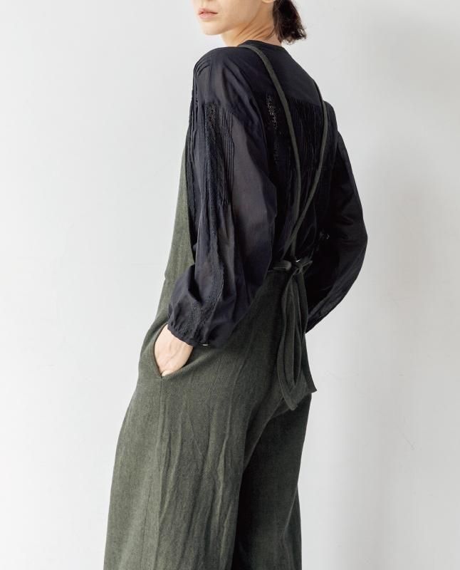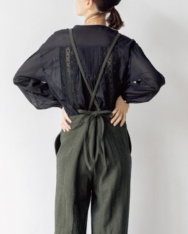 前パンツにタックを入れて太めのシルエットながら、スッキリ見せたサロペットパンツ。