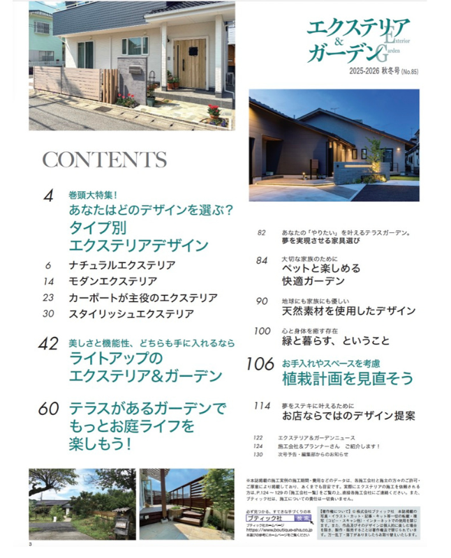 巻頭大特集は「デザイン別で選ぶエクステリア」。ナチュラル、モダン、スタイリッシュ…好みや建物に合わせたエクステリアを多数掲載。他、秋の夜長をお家で楽しむ「ライトアップガーデン」や「ペットと暮らすお庭」など見逃せない企画が盛りだくさん!A4変判(297×233mm)